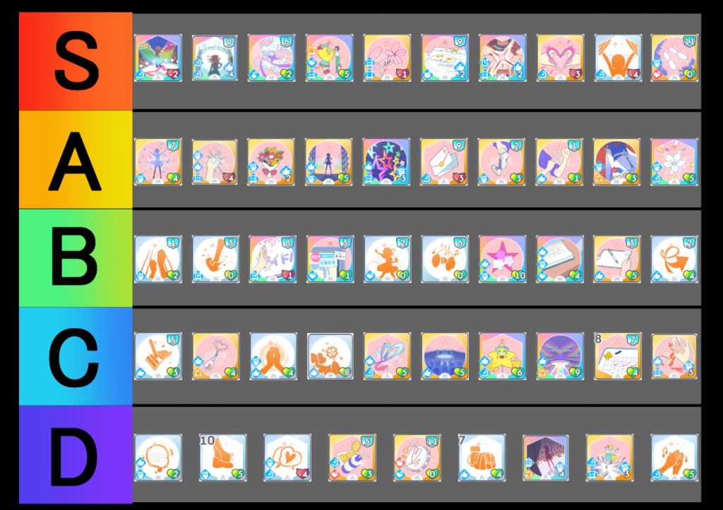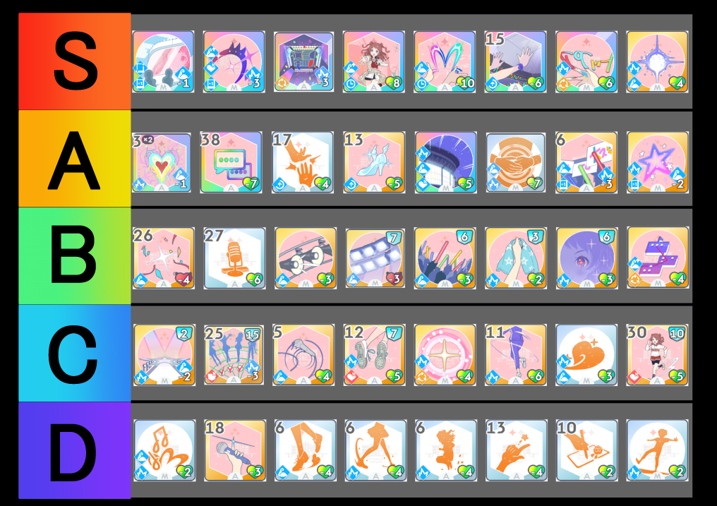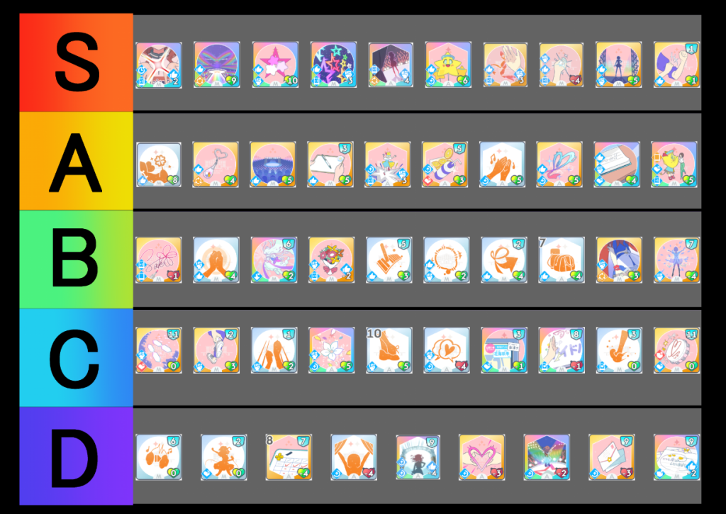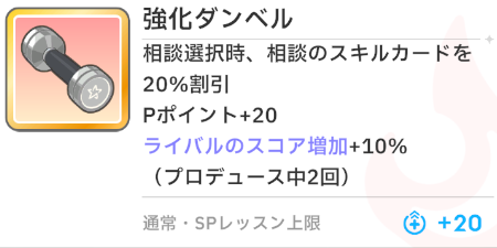 ![]() | 好印象が重要なアイドルによっては一考の余地あり(冠菊ことねなど) レッスン上限上昇量は+15で1位 「好印象+2」で固有アイテムの起動など 「体力減少2」はデメリットにならない |