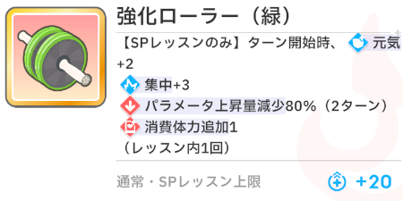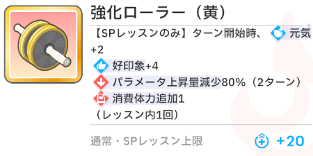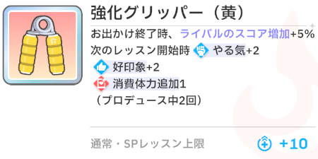 ![]() | お出かけを選択することがないため、「やる気+2」「好印象+2」の恩恵を得られない。 レッスン上限上昇量が+10のため、+15のアイテムと比べておすすめできない。 |