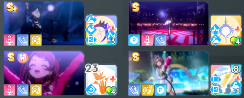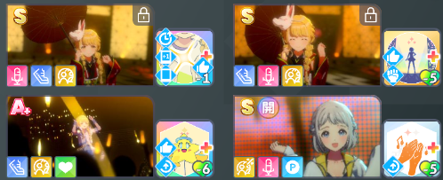 ![]() | 今はあえて、背を向けて ・強力なPアイテム ・VoSPレッスン率UP | SRだが優秀 何やってるんだろう、と組み合わせて編成したい。 どのガシャからも入手可能 |