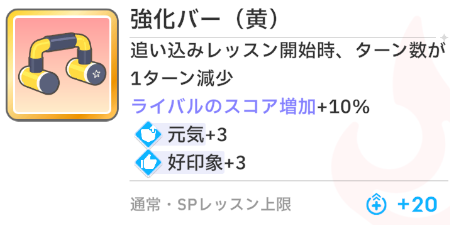 初ターンに本番前夜を使用すると体力を5消費しますが、「次のレッスン開始時元気+3」のバフで体力減少を減らすことができます。なお2枠目で強化バーを選択する場合は「追い込みレッスン開始時元気+3」があるため強化バンドがよい場合が多い。