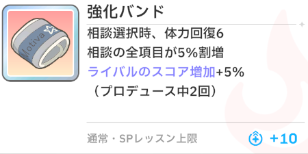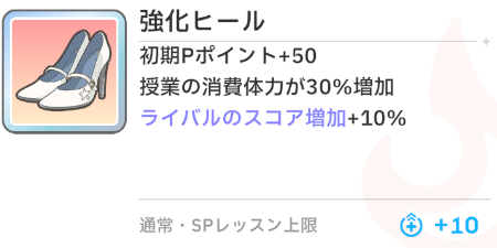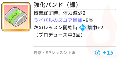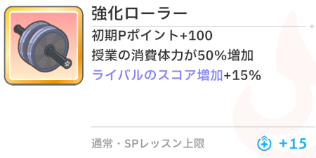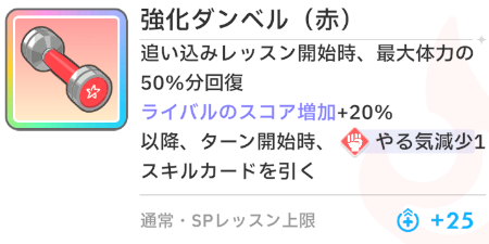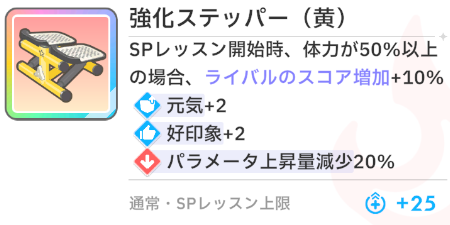![]() | 活動支給を選択することが少ないため、「やる気+2」「好印象+2」の恩恵を得られない。 レッスン上限上昇量が+10のため、+15のアイテムと比べてお勧めできない。 |