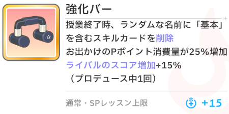 ![]() | レッスン上限上昇量は+15で2位 「基本スキルカード削除」1枚程度なら悪くない。 お出かけはしないため、実質デバフなし レッスン上限上昇量+20を使いたいところだが、これに逃げるものあり |