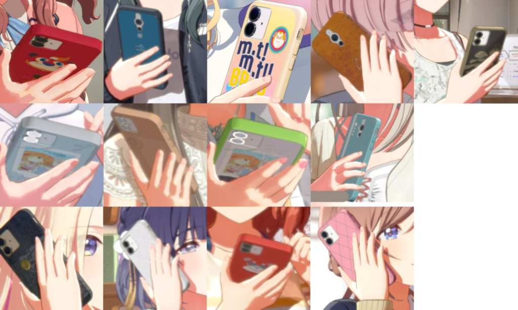 補足として、ゲーム内では手毬と広がiPhoneではないためグッズのスマートフォンケースとカメラの位置が異なる。