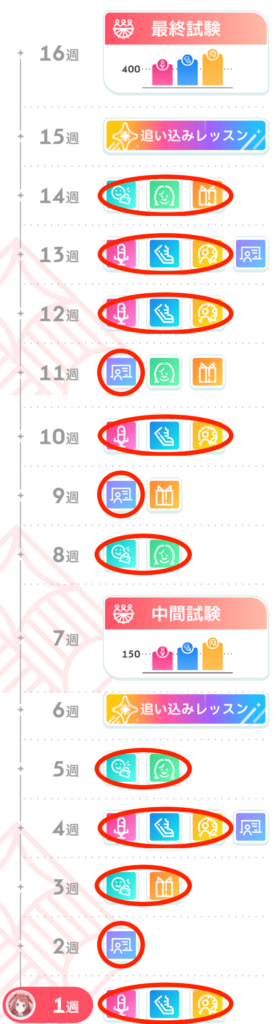 全てSPレッスンを選択することができました。1週のレッスンは30くらい残してperfectクリアできず・・・