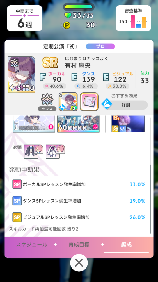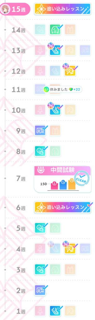 「総合芸術」をメモリーで所持していなかったため、スキルカード再抽選の権利を15週の追い込みレッスン後まで残しておきました。最終試験前の追い込みレッスン後に得られるスキルカードは虹スキルカードの確率が高いので、メモリーにない場合はこのような立ち回りもありです。