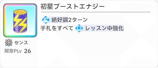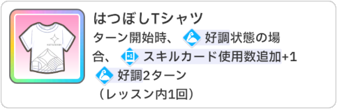 好印象カードがサポカ「迷子のお知らせです」のPアイテムで手に入る「本番前夜」のみだったため、「私がスター」に使う好印象補充で「星屑センセーション」「やる気は満点」が欲しかったです。