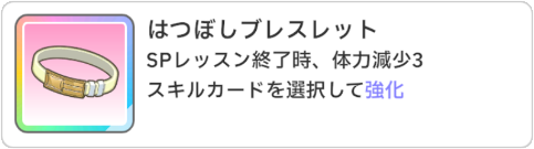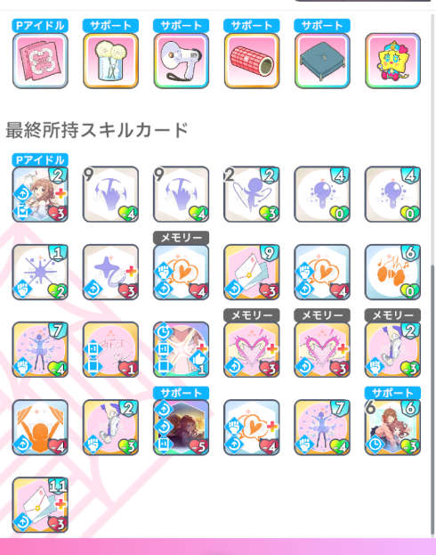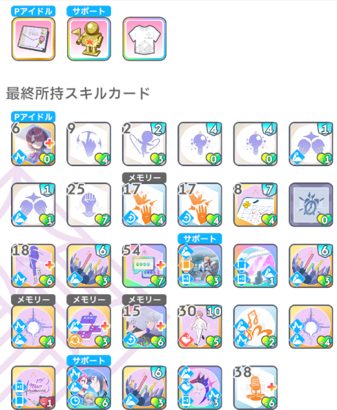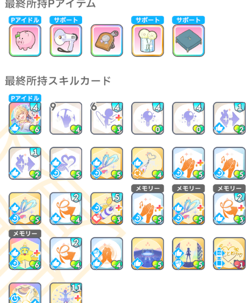 Pアイテムの効果、開始時「本番前夜+」を手札に生成が強く、全レッスンのperfectを安定的に出すことができました。