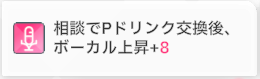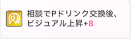 サポートカード「ゆっくりと過ごしましょう」に「相談でPドリンク交換後、ビジュアル上昇」が付いているので、最終試験前の相談ですべてのドリンクを交換しています。