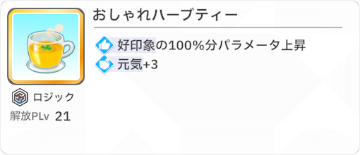 「烏龍茶」は+7「おしゃれハーブティー」は+3で正直誤差の範囲ですが、「烏龍茶」の方が強いかと思います。ただし好印象が多めにある場合は「おしゃれハーブティー」の方が強いかもしれません。正直あまり変わりません。