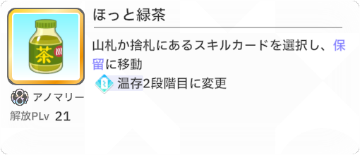 「ほっと緑茶」は山札か捨て札にあるスキルカードを選択して保留に移動します。
