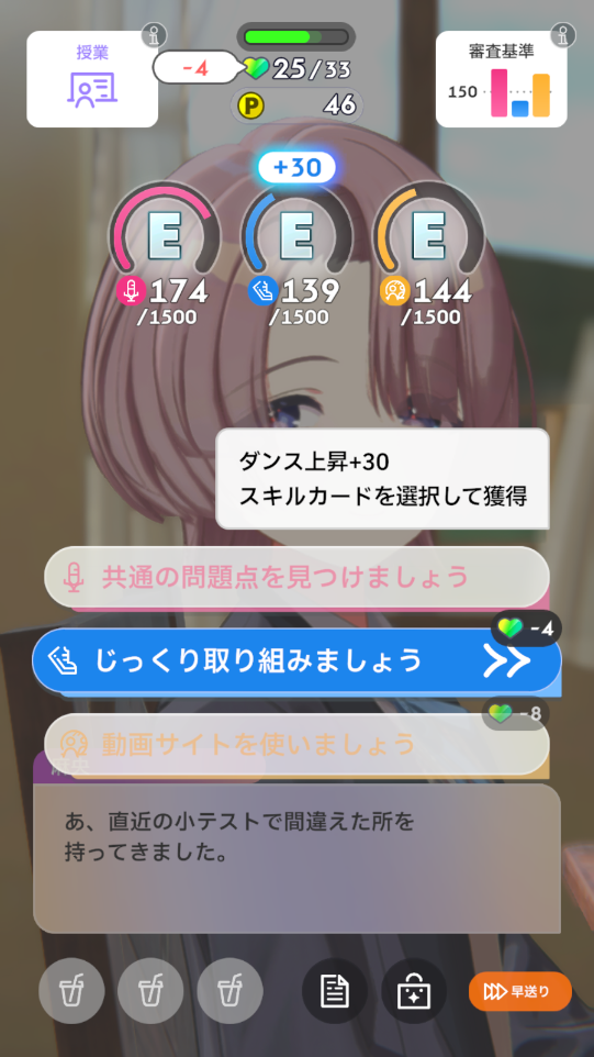 序盤でやる気・元気をしっかり貯めて後半に火力カードを打ち続ける。という基本的な行動もスキルカードの回り方が良く、上手くできた記憶があります。