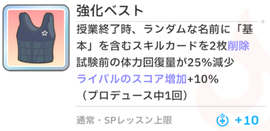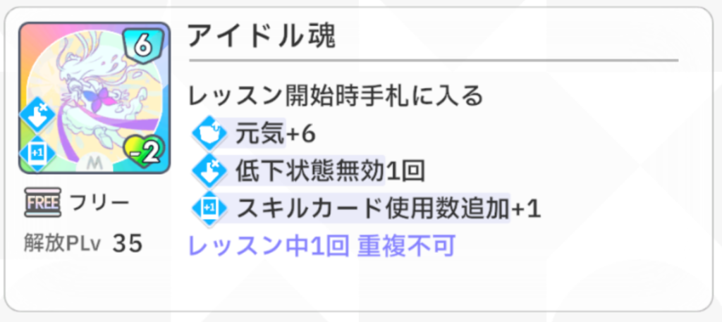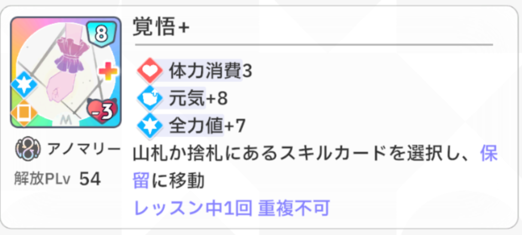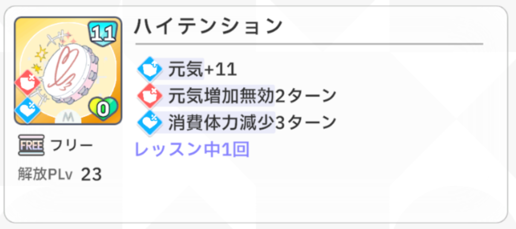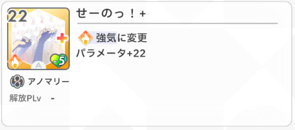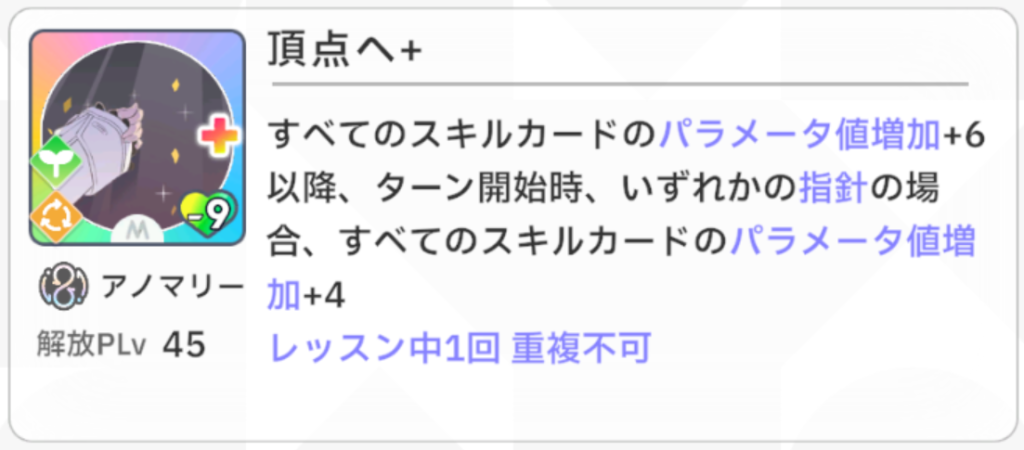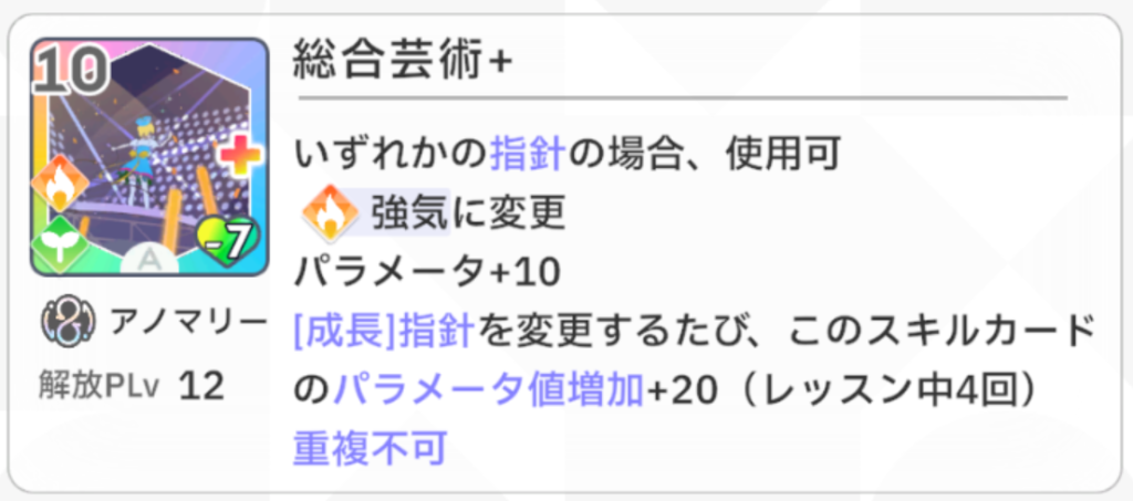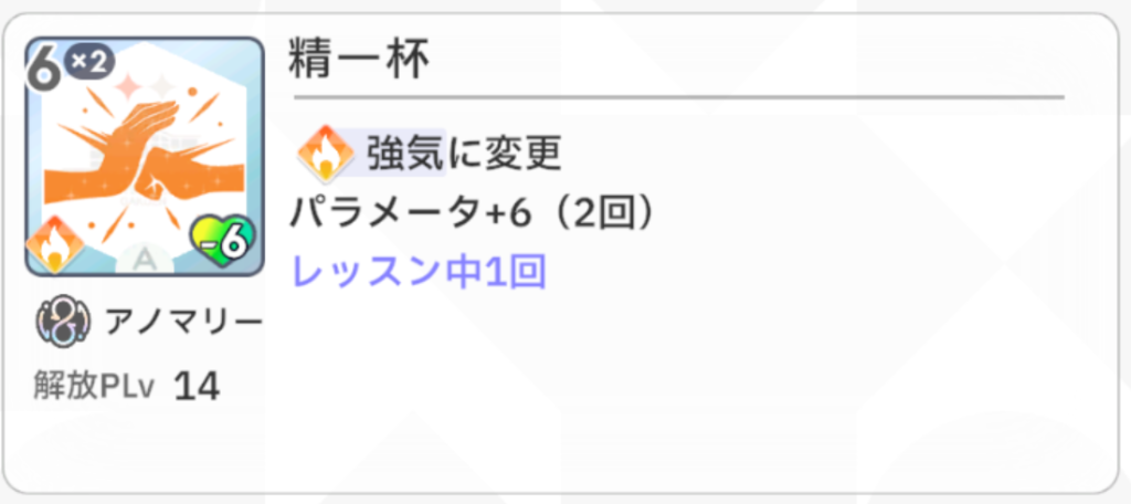 『手札のパラメータ上昇回数増加+1』という効果がとても強力で、例えば『総合芸術+』が手札にあるときに使用すると、『総合芸術+』の『パラメータ+10』が『パラメータ+10(2回)』に強化されます