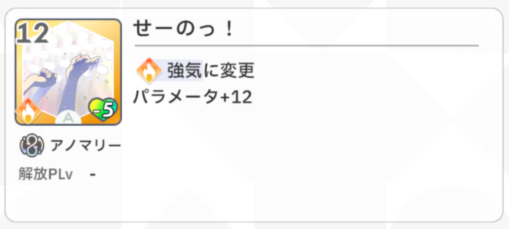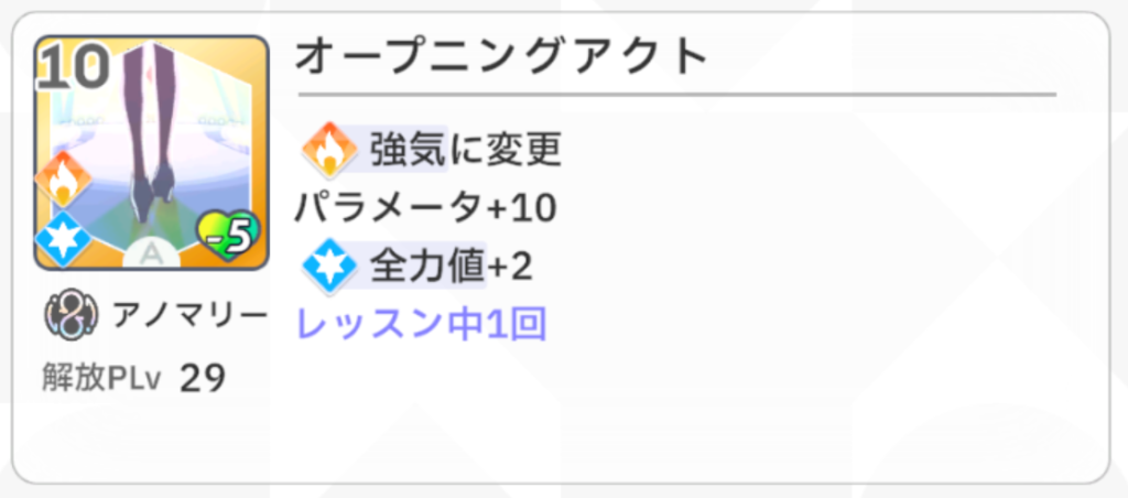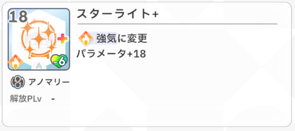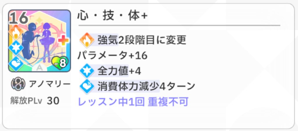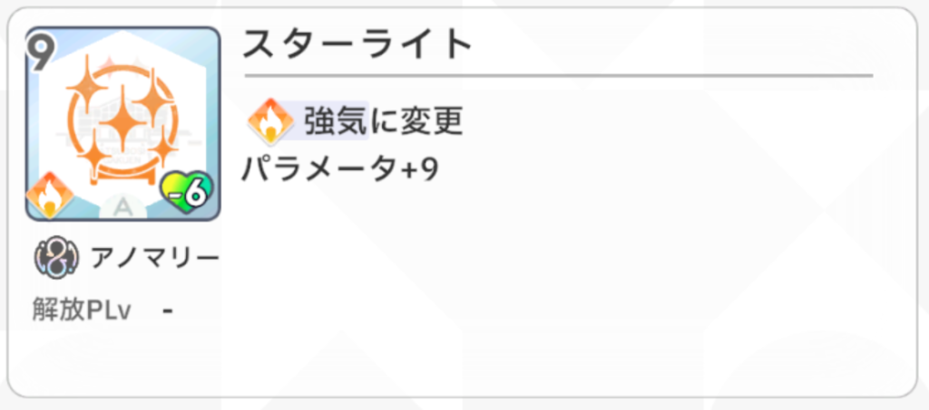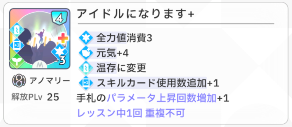 『以降、ターン開始時、いずれかの指針の場合、すべてのスキルカードのパラメータ値+4』という効果が『アイドルになります』の効果と相性抜群で、このカードを最終試験の序盤で引けるとかなり嬉しいです