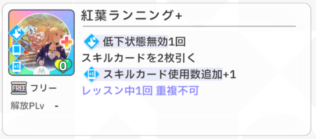 (サポカ『ぜったい追いついてやる!』のスキルカード『紅葉ランニング』のように、『スキルカード使用数+1』と『スキルカードを引く』を併せ持っている場合を除く)