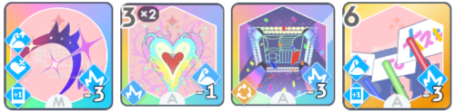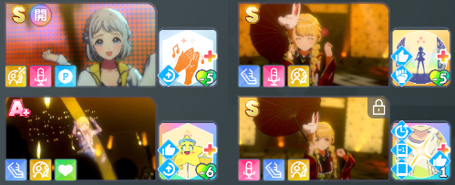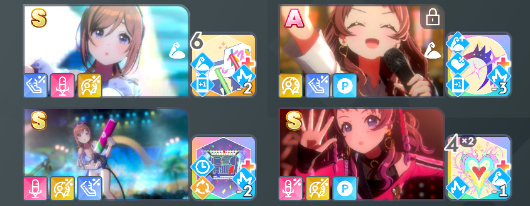 Pレベルやアイドルによりますが、魅惑の視線(絶好調付与)、ハイタッチ(開始時の火力)、静かな意思(バフ)、国民的アイドル(自由枠)の4枚が基本となります。可能な限り強化済み(+が付いているもの)を編成しましょう。