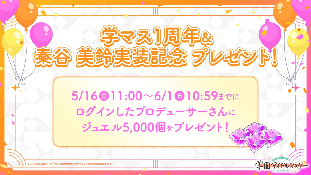 学マス1周年&秦谷美鈴の実装を記念して、5月16日(金)11:00~6月1日(日)10:59の間にログインするとジュエル5,000個配布されます!