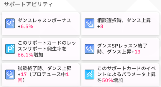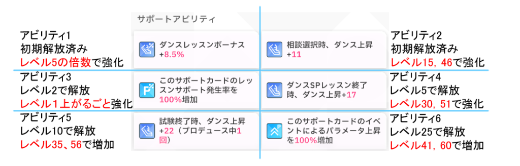 サポートカードにはアビリティが6つついており、それぞれ解放と強化されるタイミングが固定されています。