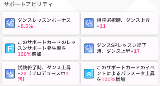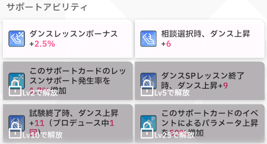 サポートカードのアビリティはレベルアップに伴って、解放または効果の上昇が発生します。
