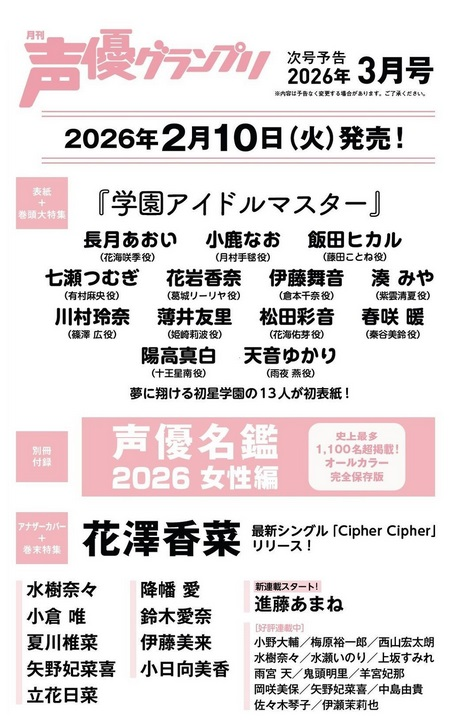 声優グランプリ3月号 2026 1/09 ad 2026年1月9日 イベント詳細 日付: 2026年2月10日 カテゴリ: グッズ・コラボ情報 声優グランプリ3月号 【本日のおすすめ①】篠澤 広~光景ver.~フィギュア TAITO GEAR&GOODS限定フィギュアが予約開始! TAITO GEAR&GOODS TAITO GEAR&GOODS ポチップ 目次発売日等 学園アイドルマスターのプレイアブルアイドル声優13人が表示&巻頭大特集!2026年2月10日(火)発売 予約サイト Amazon Amazon 詳細 【本日のおすすめ②】学園アイドルマスターウエハース3 予約開始! Amazon 楽天市場 ポチップ よかったらシェアしてね! URLをコピーしました! URLをコピーしました! GOLD RUSH5巻発売日 ツアマス第4弾アプデ配信 関連記事 メンバー限定MOIW2025特別配信DAY2 2026年1月9日 メンバー限定MOIW2025特別配信DAY1 2026年1月9日 ツアマス第4弾アプデ配信 2026年1月9日 GOLD RUSH5巻発売日 2026年1月9日 ローソンプリント 2025年12月31日 ローソン受取 2025年12月31日 なりきりからあげクンぬい受取日 2025年12月31日 放送部70 2025年12月27日
