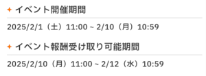 シーズンイベント報酬終了日 2025 2/09 ad 2025年2月2日2025年2月9日 イベント詳細 日付: 2025年2月11 – 12日 カテゴリ: ゲーム情報 目次シーズンイベント「バレンタイン協奏曲」報酬受け取り最終日 【本日のおすすめ①】月村手毬[PLUM]フィギュア 最安は楽天市場!あみあみ・ゲーマーズは特典付き! まとめ記事 まとめ記事 ポチップ 【報酬受け取り期限】2025/02/12(水)10:59 イベントガシャを引くためのアイテムが消失すると思われます。忘れずに引きましょう! 【本日のおすすめ②】おなまえぴたんコシリーズグッズ アクスタや缶バッジ、アクキーが登場!楽天市場にて定価よりお安く買えます! 楽天市場 まとめ記事 ポチップ よかったらシェアしてね! URLをコピーしました! URLをコピーしました! ハッピーミルフィーユガシャVol1 にょきんと 関連記事 星南・莉波のハートエプロン 2026年2月18日 Lady Rabbitグッズ通販 2026年2月16日 2nd Period 一般2次先行抽選申込 2026年2月14日 アプデ(ver.2.9.0) 2026年2月14日 放送部76 2026年2月14日 MOIWカスタマイズグッズ 2026年2月13日 伊勢丹コラボ二次(先着) 2026年2月9日 放送部75 2026年2月7日
