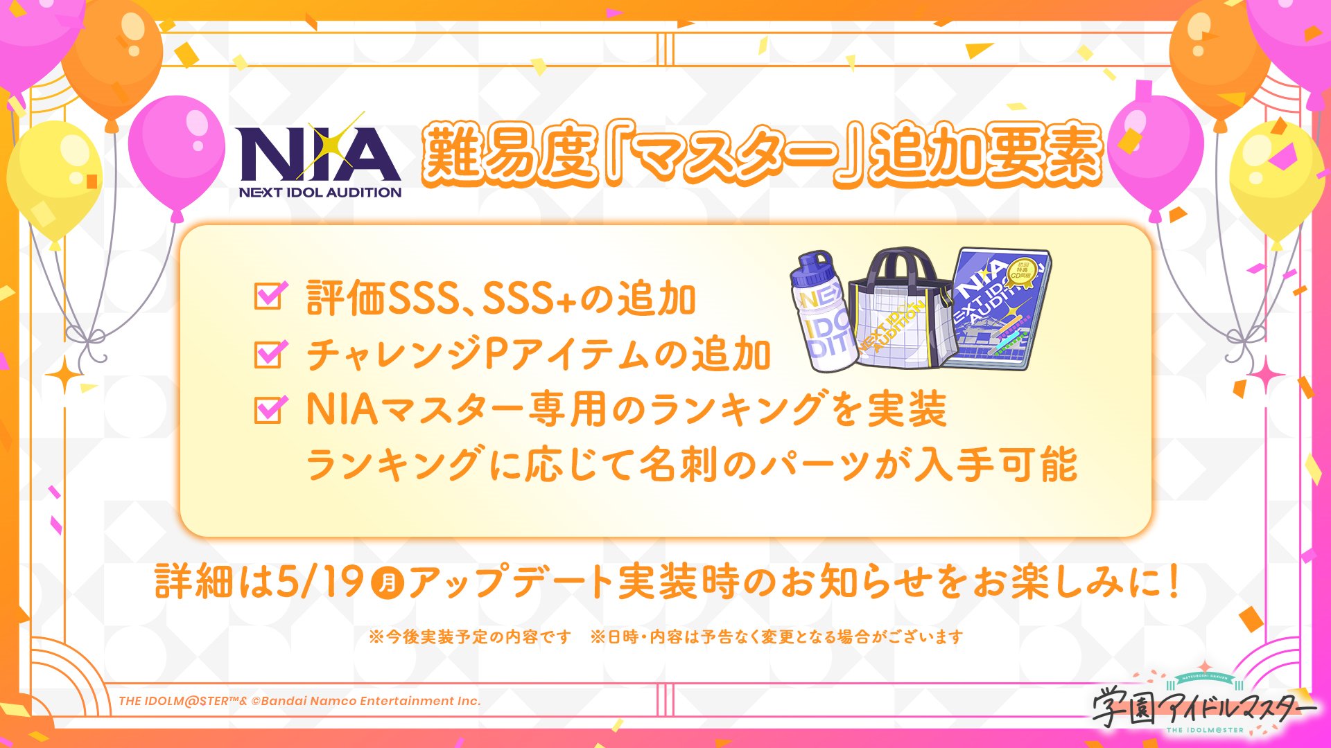 NIAマスター追加 2025 4/29 ad 2025年4月29日 イベント詳細 日付: 2025年5月19日 カテゴリ: ゲーム情報 NIA「マスター」追加! 【本日のおすすめ①】篠澤 広~光景ver.~フィギュア TAITO GEAR&GOODS限定フィギュアが予約開始! TAITO GEAR&GOODS TAITO GEAR&GOODS ポチップ 以下の内容が追加されます!・評価SSS,SSS+追加・チャレンジPアイテム追加・NIAマスター専用のランキングを実装・ランキングに応じて名刺のパーツが入手可能 【実装日】2025年5月19日(月) 【本日のおすすめ②】学園アイドルマスターウエハース3 予約開始! Amazon 楽天市場 ポチップ よかったらシェアしてね! URLをコピーしました! URLをコピーしました! 初星学園校歌サブスク・DL配信 特訓7追加(麻央、広、莉波) 関連記事 初星学園HR #STEP3 月村 手毬 2026年1月12日 放送部71 2026年1月10日 メンバー限定MOIW2025特別配信DAY2 2026年1月9日 メンバー限定MOIW2025特別配信DAY1 2026年1月9日 ツアマス第4弾アプデ配信 2026年1月9日 声優グランプリ3月号 2026年1月9日 GOLD RUSH5巻発売日 2026年1月9日 ローソンプリント 2025年12月31日