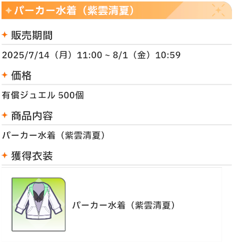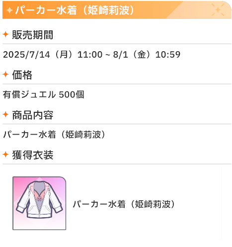 清夏・莉波水着 2025 7/14 ad 2025年7月14日 イベント詳細 日付: 2025年7月14 – 8月1日 カテゴリ: ゲーム情報 清夏・莉波水着衣装販売! セミブルー期間限定ガシャ対象だった清夏・莉波はアナザー衣装が存在しませんでしたが、販売開始されました! 【本日のおすすめ③】Paludeコラボグッズ 美鈴をメインとしたコラボグッズ通販が開始!モコモコ可愛いグッズが多いです!! Paludeトップ まとめ記事 ポチップ 目次販売期間 7/14(月) 11:00~8/1(金)10:59 価格 有償ジュエル500個 【本日のおすすめ④】PalVerse 学園アイドルマスター vol.1 Vol1では6アイドルが登場!DMMが17%OFFで最安値です! DMM まとめ記事 ポチップ よかったらシェアしてね! URLをコピーしました! URLをコピーしました! 放送部#46 ツアマス学マス追加 関連記事 放送部71 2026年1月10日 メンバー限定MOIW2025特別配信DAY2 2026年1月9日 メンバー限定MOIW2025特別配信DAY1 2026年1月9日 ツアマス第4弾アプデ配信 2026年1月9日 声優グランプリ3月号 2026年1月9日 GOLD RUSH5巻発売日 2026年1月9日 ローソンプリント 2025年12月31日 ローソン受取 2025年12月31日