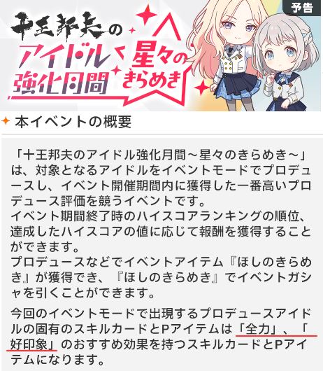 アイドル強化月間(リーリヤ・星南) 2025 12/13 ad 2025年12月4日2025年12月13日 イベント詳細 日付: 2025年12月8 – 17日 カテゴリ: ゲーム情報 アイドル強化月間(リーリヤ・星南) 【本日のおすすめ③】Paludeコラボグッズ 美鈴をメインとしたコラボグッズ通販が開始!モコモコ可愛いグッズが多いです!! Paludeトップ まとめ記事 ポチップ 目次開催期間 2025年12月8日(月)11:00〜12月18日(木)4:59 詳細等 今回の対象アイドルは、『葛城リーリヤ・十王星南』 対象のおすすめ効果は『全力・好印象』です! 【本日のおすすめ④】PalVerse 学園アイドルマスター vol.1 Vol1では6アイドルが登場!DMMが17%OFFで最安値です! DMM まとめ記事 ポチップ よかったらシェアしてね! URLをコピーしました! URLをコピーしました! Atmosphereサブスク リーリヤ親愛度ブーストCP 関連記事 放送部71 2026年1月10日 メンバー限定MOIW2025特別配信DAY2 2026年1月9日 メンバー限定MOIW2025特別配信DAY1 2026年1月9日 ツアマス第4弾アプデ配信 2026年1月9日 声優グランプリ3月号 2026年1月9日 GOLD RUSH5巻発売日 2026年1月9日 ローソンプリント 2025年12月31日 ローソン受取 2025年12月31日