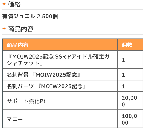 MOIW2025記念パック 2025 12/14 ad 2025年12月14日 イベント詳細 日付: 2025年12月13 – 2026年2月1日 カテゴリ: ゲーム情報 MOIW2025記念パック販売 【本日のおすすめ③】Paludeコラボグッズ 美鈴をメインとしたコラボグッズ通販が開始!モコモコ可愛いグッズが多いです!! Paludeトップ まとめ記事 ポチップ 目次販売期間 2025年12月13日(土)20:30~2026年2月1日(日)10:59 詳細 『MOIW2025記念 SSR Pアイドル確定ガシャチケット』から出てくるカードは以下になります。(ツキノカメまでの恒常Pアイドルです。) 【本日のおすすめ④】PalVerse 学園アイドルマスター vol.1 Vol1では6アイドルが登場!DMMが17%OFFで最安値です! DMM まとめ記事 ポチップ よかったらシェアしてね! URLをコピーしました! URLをコピーしました! MOIW2025Blu-ray受注 あさり先生のプロデュースゼミ 関連記事 ツアマス第4弾アプデ配信 2026年1月9日 声優グランプリ3月号 2026年1月9日 GOLD RUSH5巻発売日 2026年1月9日 ローソンプリント 2025年12月31日 ローソン受取 2025年12月31日 なりきりからあげクンぬい受取日 2025年12月31日 放送部70 2025年12月27日 PLv上限解放 2025年12月26日