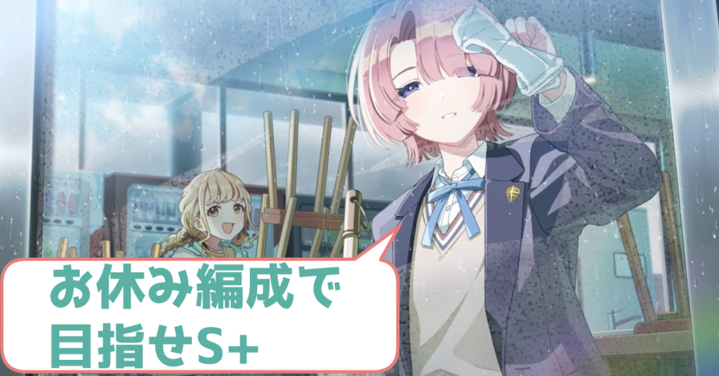 S+を取るために必要な編成および立ち回りを以下にまとめます。PL55で解放されるドリンクが無いと正直厳しいですが、チャンスはあります。お休み編成についての概要は以下リンクに記載していますので、未読の方は一読したほうが内容がわかるかと思います。 ... -