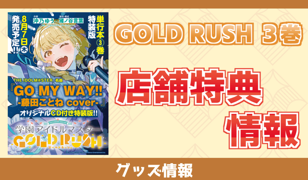 プロデューサーの皆様お疲れ様です。GOLDRUSH3巻の店舗特典情報等が出揃ってきましたのでまとめます! 3巻自体には「通常版」「特装版」の2種があり、それぞれ各店舗で販売されるため、店舗によって購入特典が異なります。 ※店舗情報は都度都度見つけ次... -